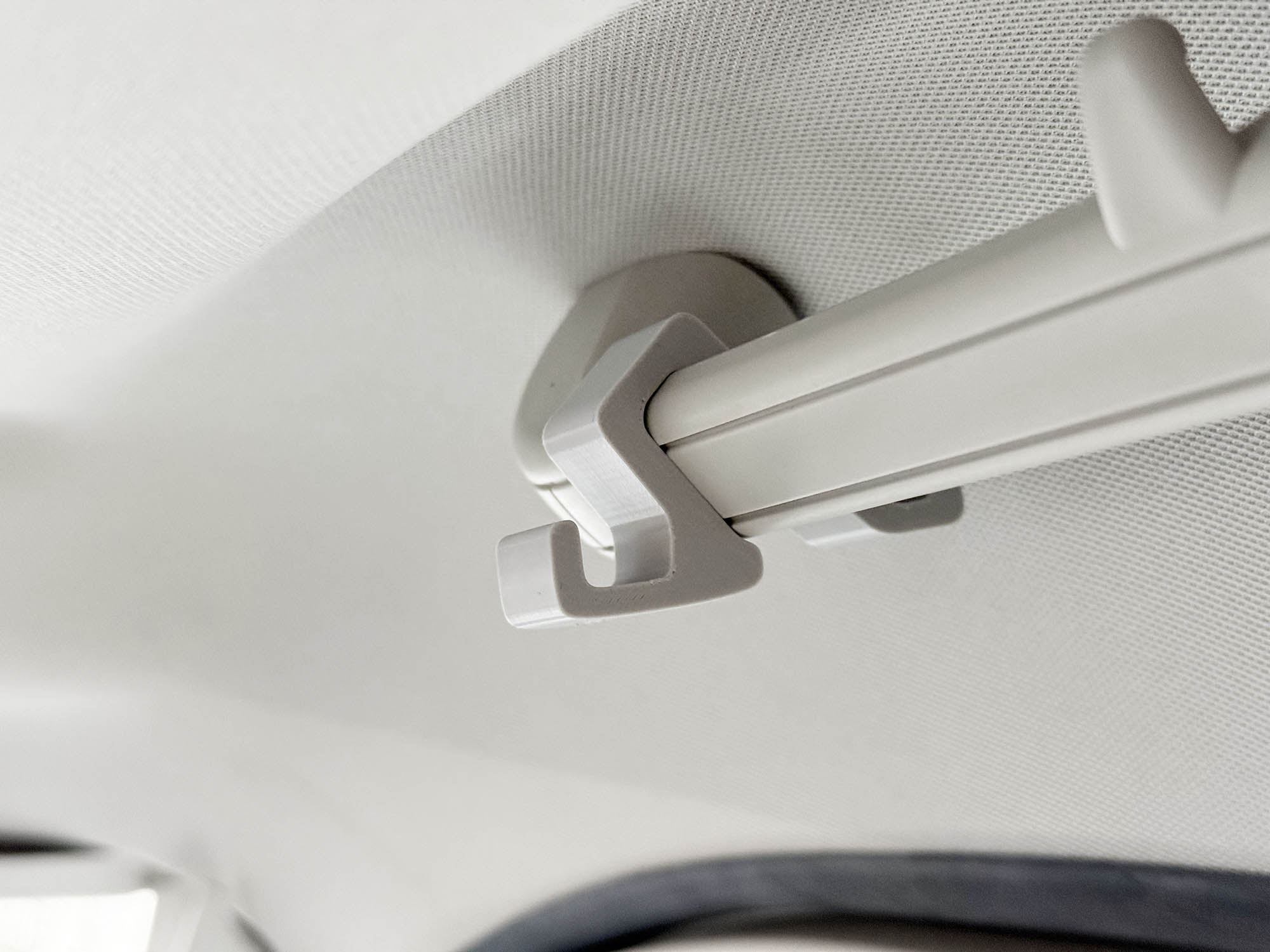 Der Camperfixx Deckengriff-Haken für Fiat Ducato nutzt den originalen Haltegriff über Fahrer- und Beifahrertür und verwandelt ihn in eine praktische Aufhängung für Jacken, Taschen oder Hoodies.